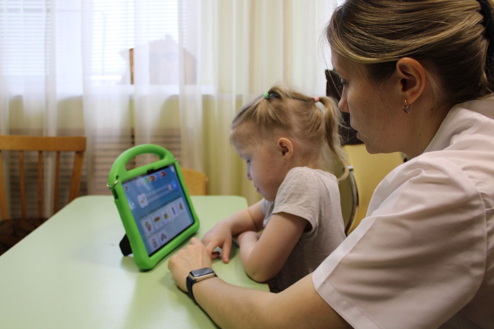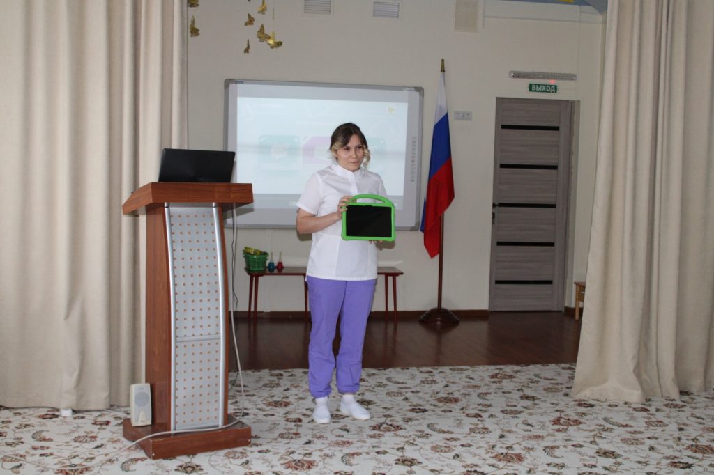 Учителем – дефектологом Галиной Нещадной на очередном занятии родительского клуба «Школа для родителей» были наглядно продемонстрированы особенности работы с планшетом, практические видеозанятия, достигнутые положительные результаты детей. Для облегчения процесса общения используются картинки, символы и тексты по программе, настроенной на индивидуальные потребности каждого ребенка.
